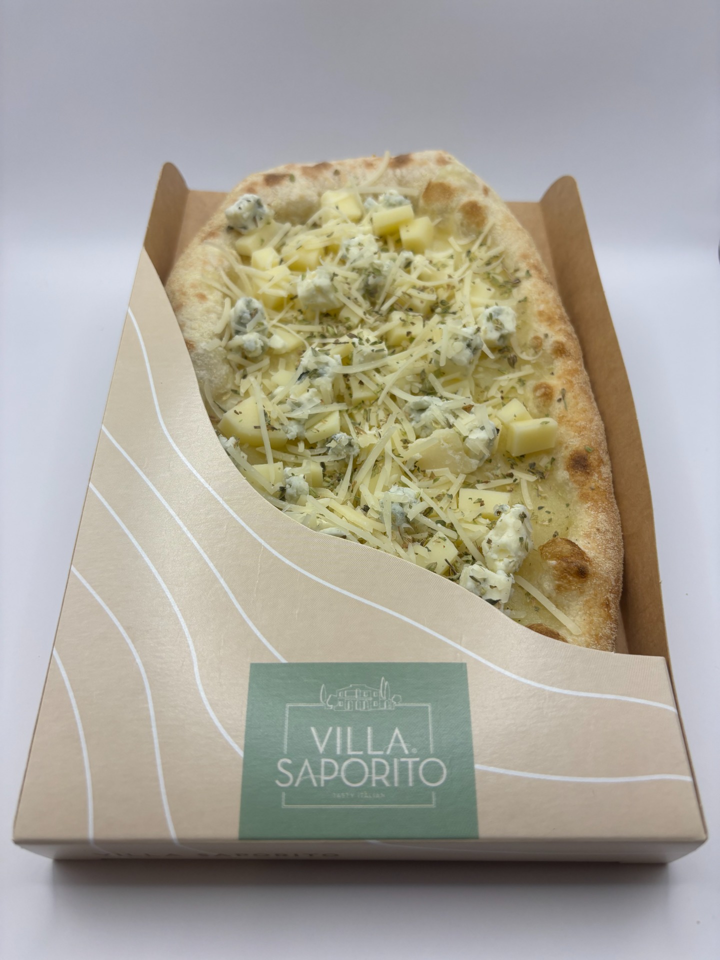 Stenugnsbakad pizza med fior di latte, provolone, gorgonzola, grana padano
