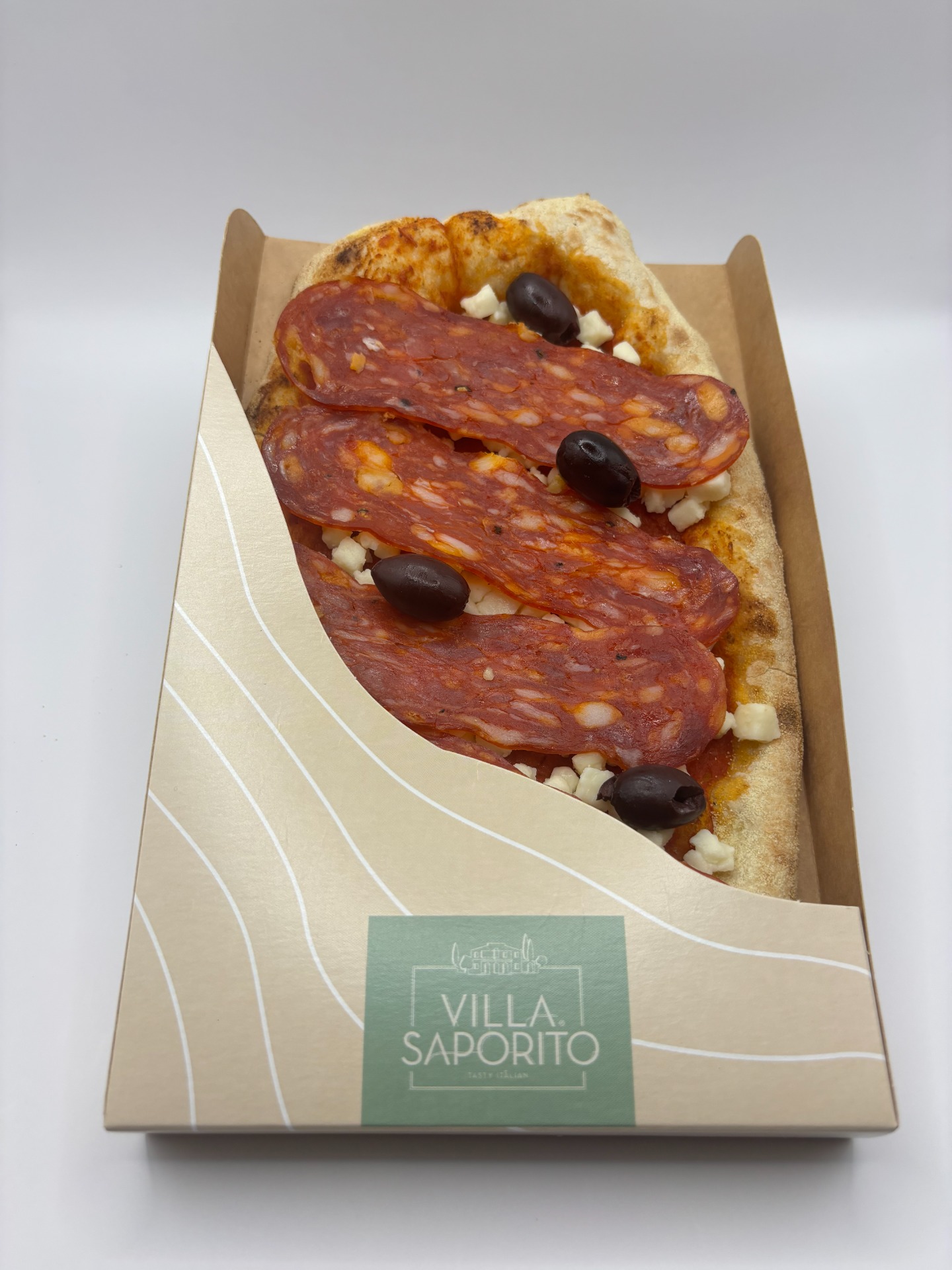 Stenugnsbakad pizza med tomatsås, fior di latte, kryddig salami, svarta oliver